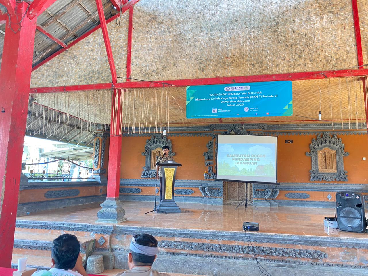 The workshop material was delivered by Putu Oki Bimantara, S.P., M.Agr., a lecturer of the Agroecotechnology Undergraduate Program, Faculty of Agriculture, Udayana University, who also serves as the Field Supervising Lecturer for the KKN-T program. In his presentation entitled “Utilization of Coffee Husk Waste as Biochar to Improve Soil pH”, he explained that biochar can enhance soil chemical properties, particularly by increasing acidic soil pH, thereby supporting improved growth and productivity of coffee plants.