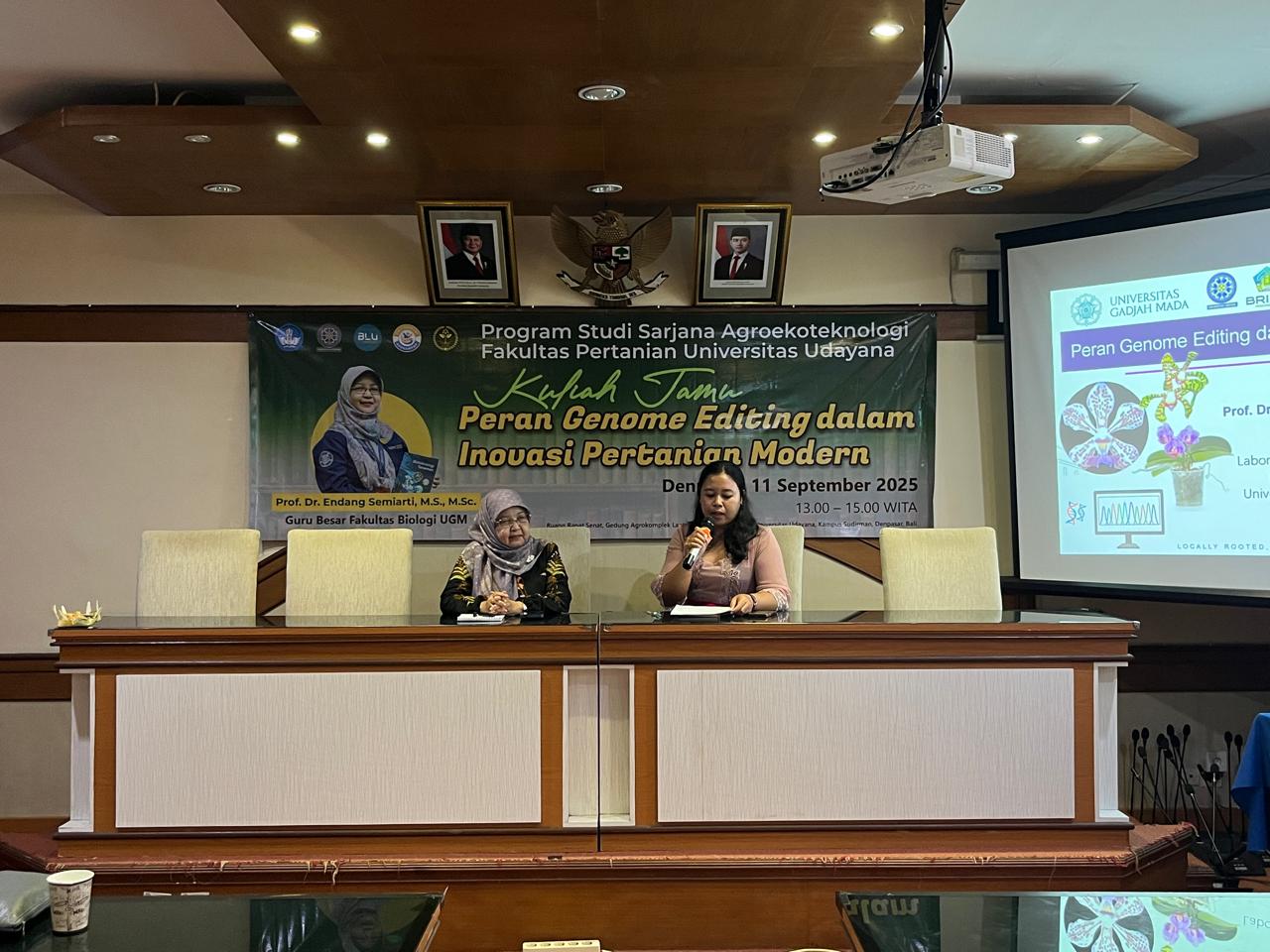 The Undergraduate Program of Agroecotechnology, Faculty of Agriculture, Udayana University, successfully held a guest lecture featuring renowned plant biotechnology expert, Prof. Dr. Endang Semiarti, M.S., M.Sc., from Gadjah Mada University. The lecture, titled “The Role of Genome Editing in Modern Agricultural Innovation”, took place on Thursday, September 11, 2025, from 1:00 PM to 3:00 PM Central Indonesia Time (WITA), at the Senate Meeting Room, 2nd Floor of the Agrocomplex Building, Sudirman Campus, Denpasar. The event was officially opened by Dr. Widhianthini, S.P., M.Si., representing the Dean of the Faculty of Agriculture, and Dr. Ida Ayu Putri Darmawati, S.P., M.Si. as the second speaker. Serving as moderator was Ni Nyoman Sista Jaya Santi, S.P., M.Biotek., with participants including undergraduate to doctoral students from the Faculty of Agriculture.