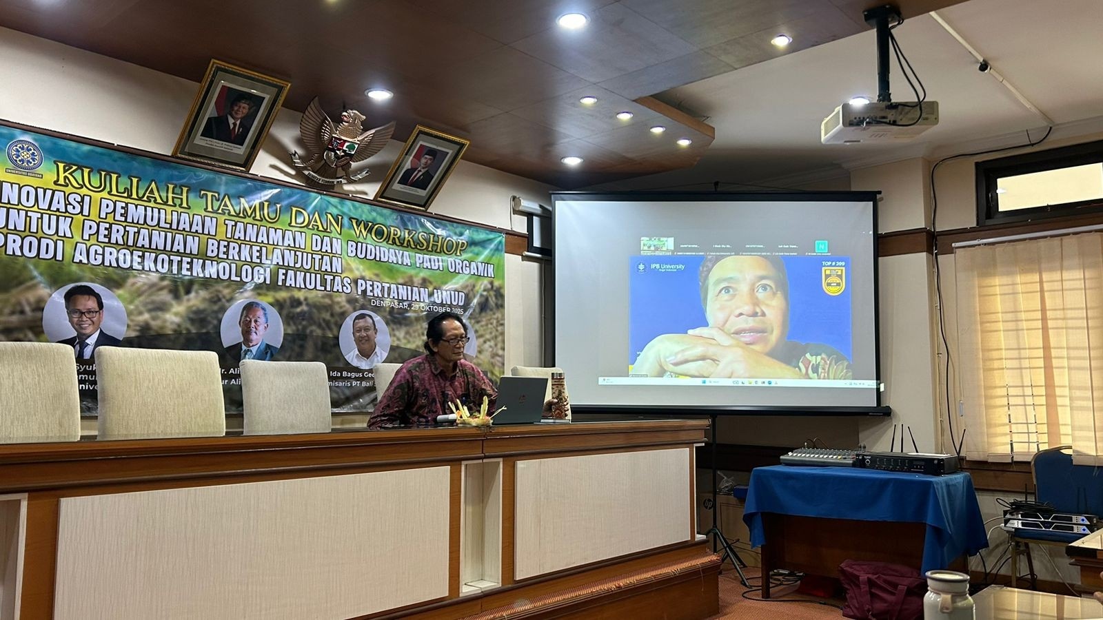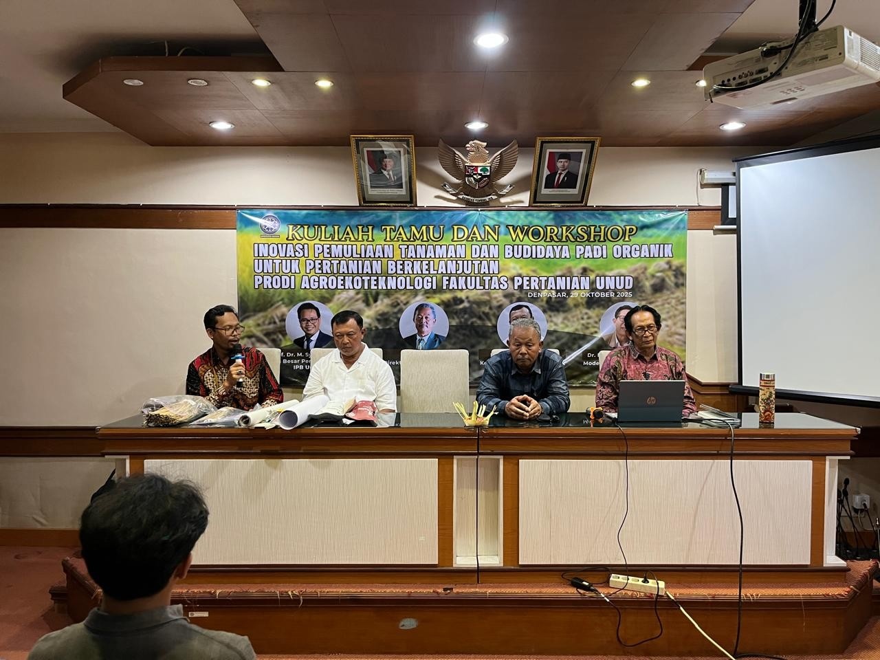 Denpasar, October 29, 2025 — The Faculty of Agriculture, Udayana University (UNUD) held a Guest Lecture and Workshop titled “Innovation in Plant Breeding and Organic Rice Cultivation for Sustainable Agriculture” at the Faculty of Agriculture, Sudirman Campus. The event began with a national anthem and a prayer, followed by opening remarks from the Chairman of the Committee, Dr. Ir. Gede Wijana, M.S., and the Dean of the Faculty of Agriculture, I Putu Sudiarta, S.P., M.Si., Ph.D., who officially inaugurated the event.
